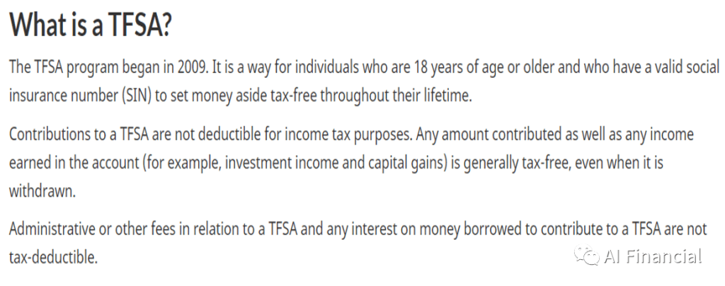 我們先來看一下TFSA的定義。TFSA全稱是Tax-FreeSavings Account,我們熟稱免稅帳戶,在2009年開始實施。它是一種只能以個人名義去開設的帳戶,開設TFSA帳戶的條件是本人必須18歲以上,持有有效的工卡就可以開戶。