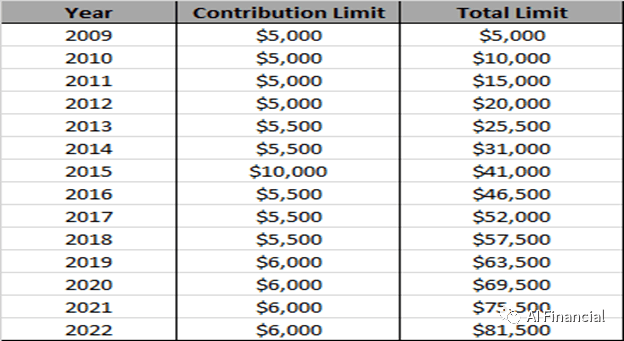剛才提到TFSA帳戶是從2009年開始實施的,如果從2009年開始,您就已經是加拿大居民,還沒有開設TFSA帳戶,那到今年2022年的總額度就是81500。也就是說TFSA的額度是可以累計的,之前沒有用的額度是可以累計到今後的年份使用。所以大家根據自己的情況參照這個表格可以估算出自己TFSA的額度有多少。