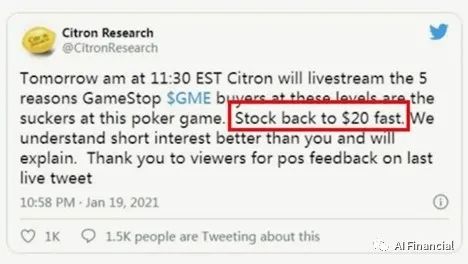 當然,華爾街的精英大空頭們也不會坐以待斃,就在1月19日,空頭開始反擊,知名做空機構香櫞(Citron)發佈公告看空GME,預言其股價將很快會跌至20美元,並將在次日發佈視頻闡述看空理由。香櫞的做空公告讓股價一度刹車甚至調頭向下。然而第二天當香櫞真的發佈了視頻後,大家卻發現他的論點毫無說服力,直播全程不僅窺屏念稿,對軋空風險也是絕口不提,香櫞潑的這瓢涼水不僅沒降了溫,反而成了火上澆油。在KEITH的號召下,GME的收盤價來到了$65的歷史新高。空頭一方開始出現強行平倉的跡象,導致GME股價在收盤時出現了大幅拉升,軋空現象開始發生。此時,香櫞宣佈自己已經放棄做空,45刀入場,90刀退出,在GME 上虧損100%。