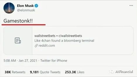 僅僅隔了一天,到了1月27日,帶貨達人馬斯克在推特上簡單地打出了GME的名字,並附上貼吧網址,就獲得了十萬加點贊,馬斯克還故意將Gamestop的單詞拼成了Gamestonk(遊戲炮火),一下子徹底點燃了GME,盤後價格飆漲50%。此時的GME股價已經起飛。GME的死忠粉,KEITH的帳戶已經從最初的5萬美金,達到了頂峰4800萬美金。